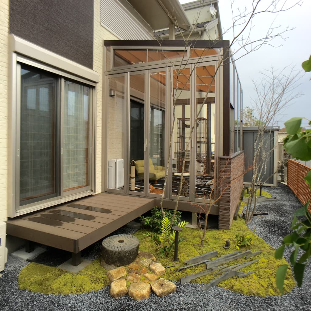 ガーデンルームはペット(猫)のお家です。左側の縁側は、和室からの眺めも考慮して、造りました。樹ら楽ステージから降りる沓脱石は、玄武岩の臼石を利用し、黒御影石の切り石を埋め、地模様にこだわりました。夜も外に出たくなるように、施工致しました。
