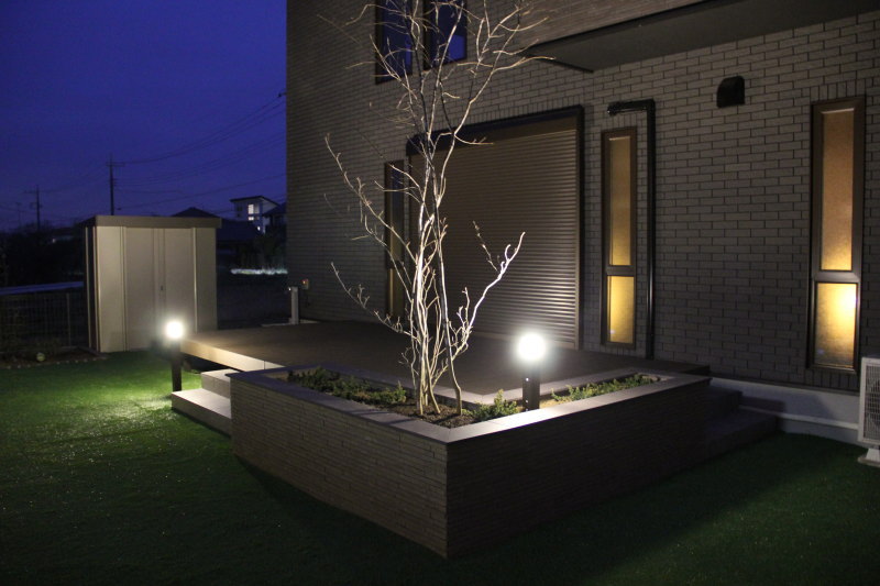 ポイントは昼夜で、お庭の表情が、変化するように、ウッドデッキにライティング(LIXILの美彩シリーズ)を埋め込み、タイルと、野村紅葉を照らし、夜も、お子様と、遊べる・仲間と集える。空間を、造らせていただきました。